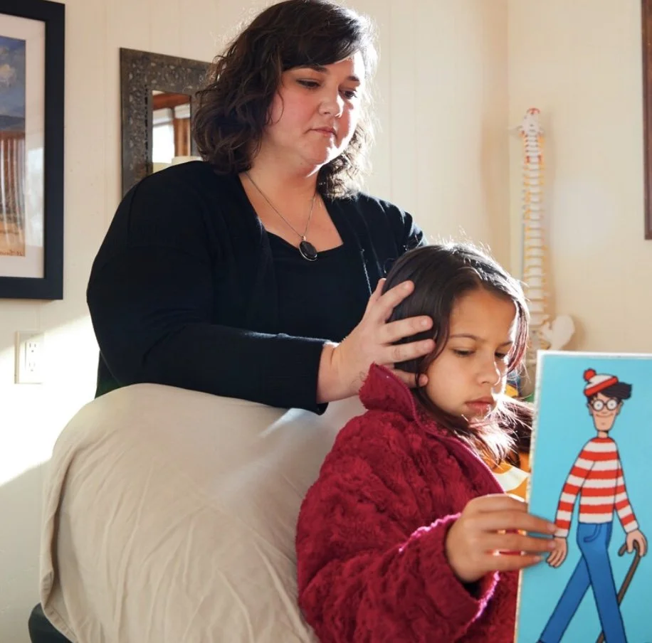 Children 5 and up are asked to lie on the treatment table to receive the work, but may sit in a reclined position to read, fidget with a toy or color if necessary to help hold their attention.